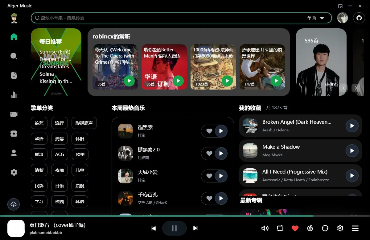 AlgerMusicPlayer 是一款开源的第三方音乐播放器,支持网易云音乐登录,并支持批量下载。