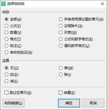WPS表格正常情下,复制表格内容后,右键点击“选择性粘贴”,会弹出下面的选项窗口: