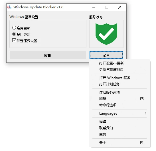 Windows Update Blocker免费、无广告、无需安装解压就能用,删除程序文件后,不会在系统留下痕迹,并支持简体中文。